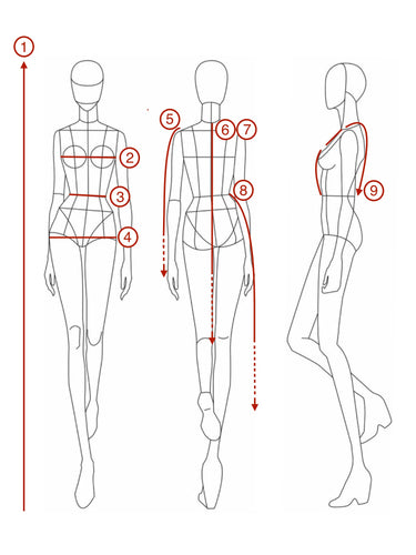 8. Dĺžka sukne a nohavíc sa meria od pása cez boky až po miesto, pokiaľ chceme aby model siahal.