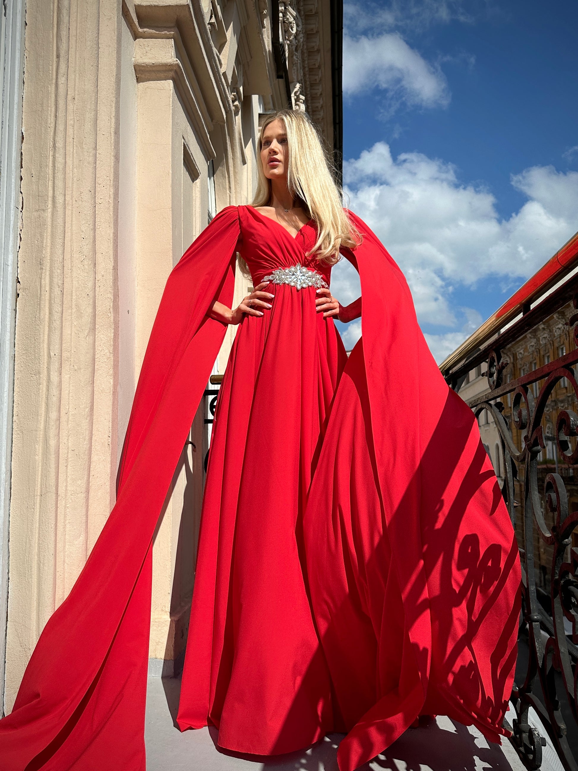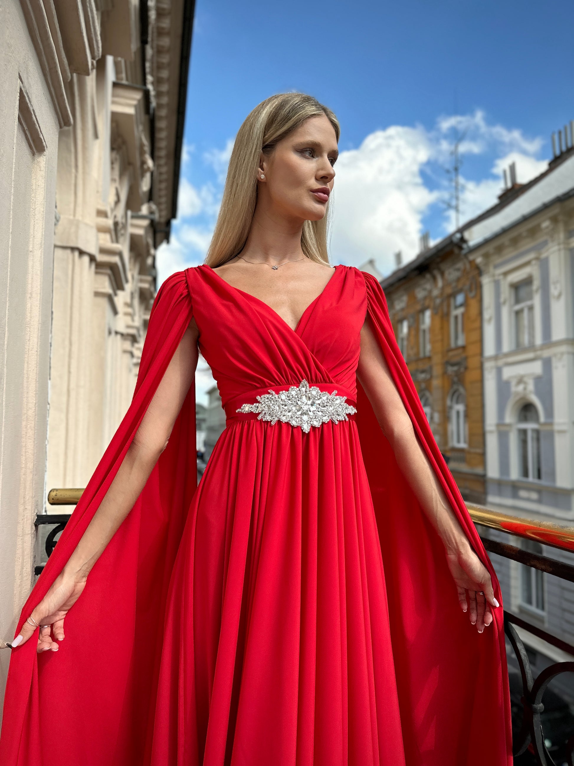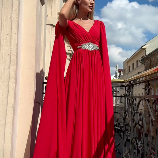 Večerné šaty SEREENA sú elegantného ženského strihu a ich pomyselnou korunou sú teatrálne dlhé rukávy, ktoré vďaka ľahkému materiálu krásne vejú a evokujú dojem vlečky.