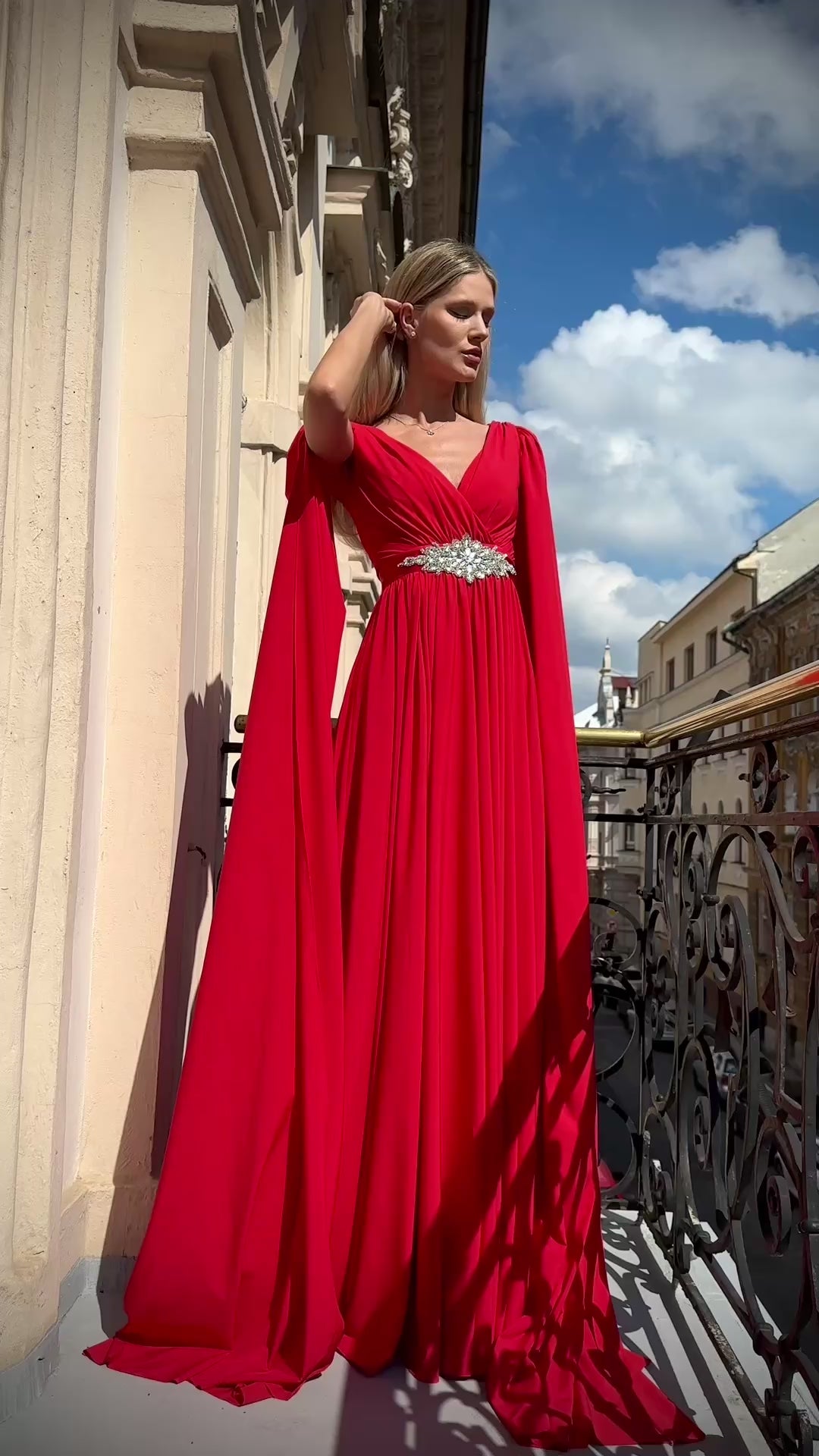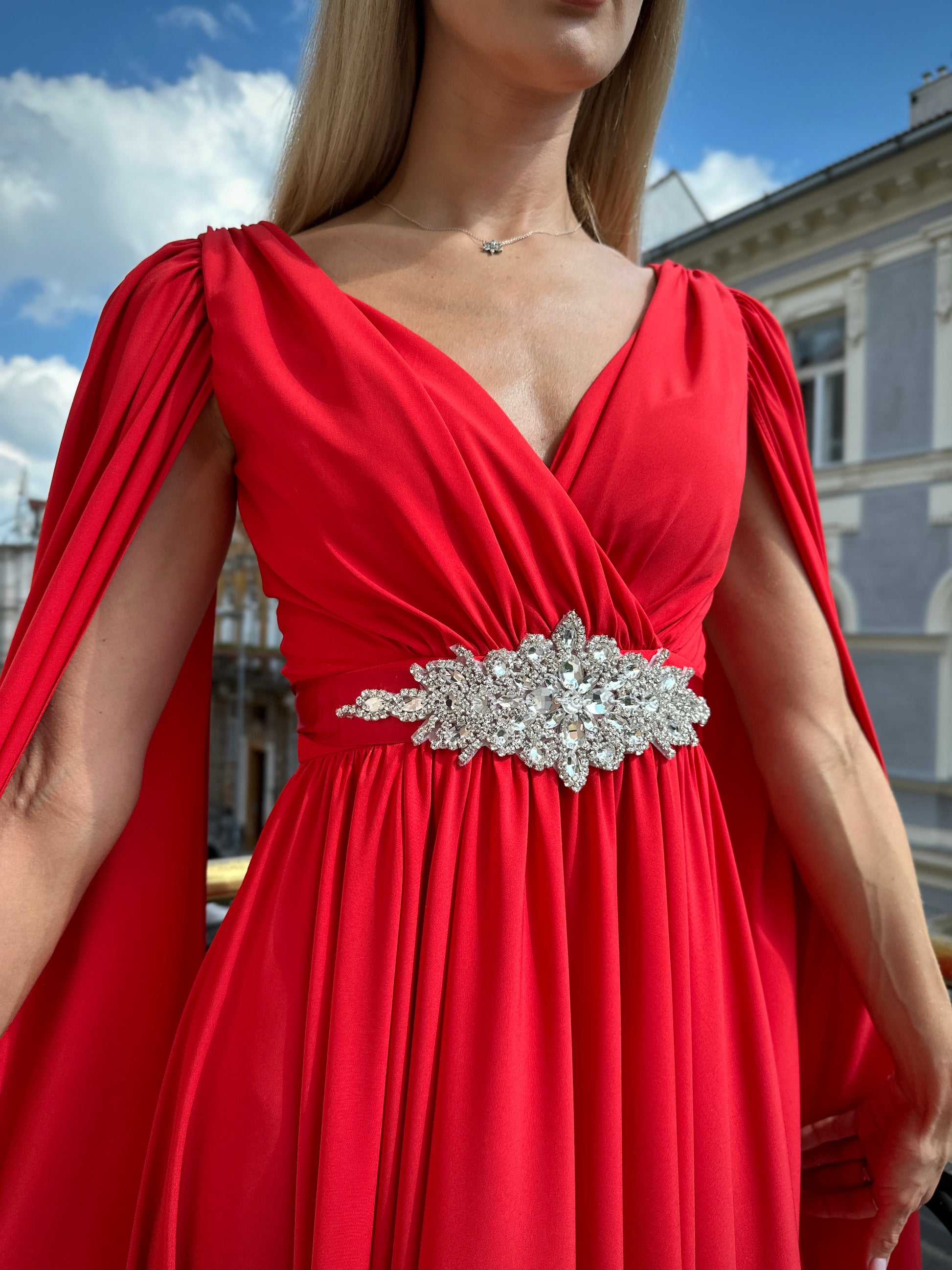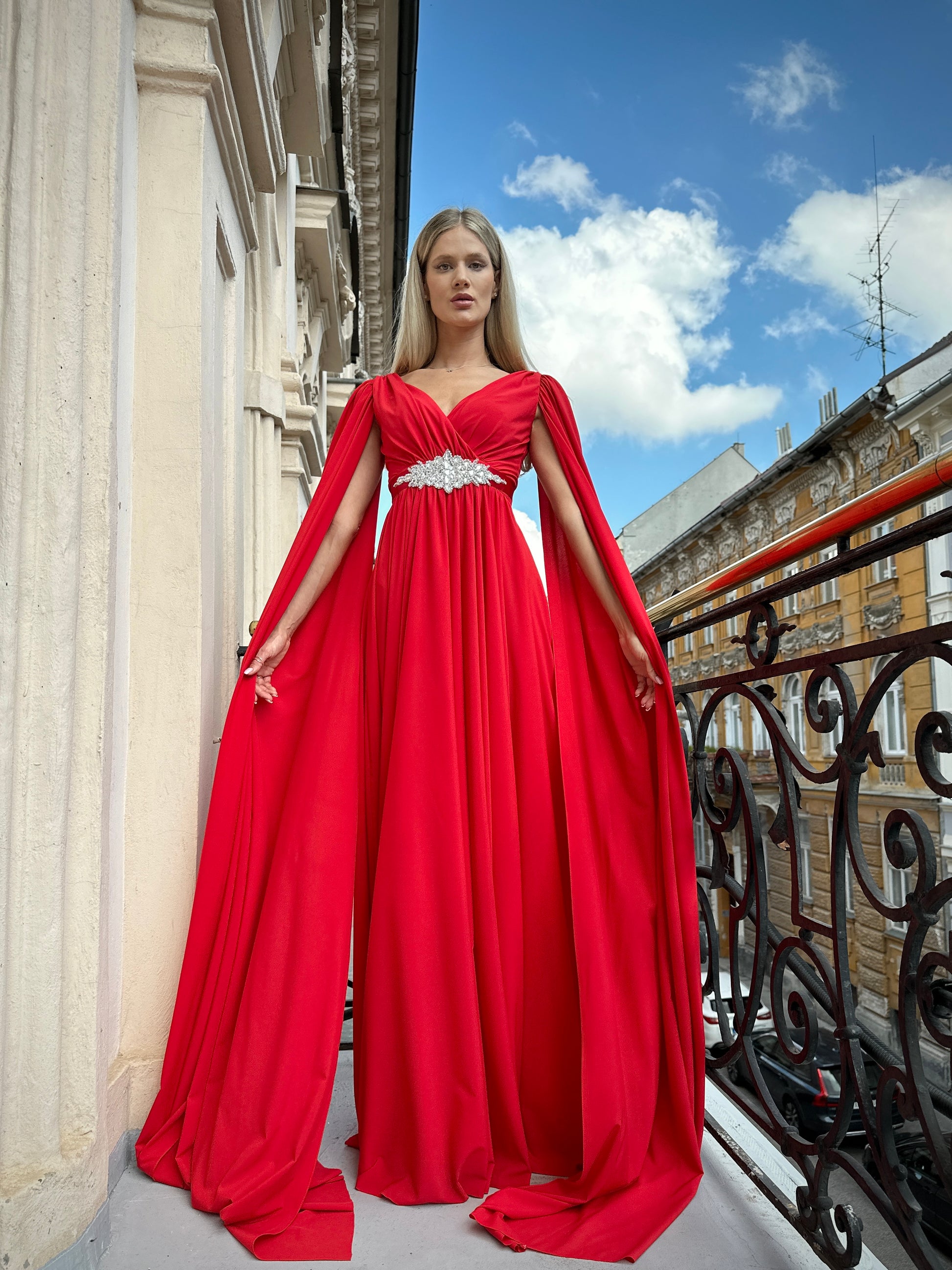 Večerné šaty SEREENA sú elegantného ženského strihu a ich pomyselnou korunou sú teatrálne dlhé rukávy, ktoré vďaka ľahkému materiálu krásne vejú a evokujú dojem vlečky.