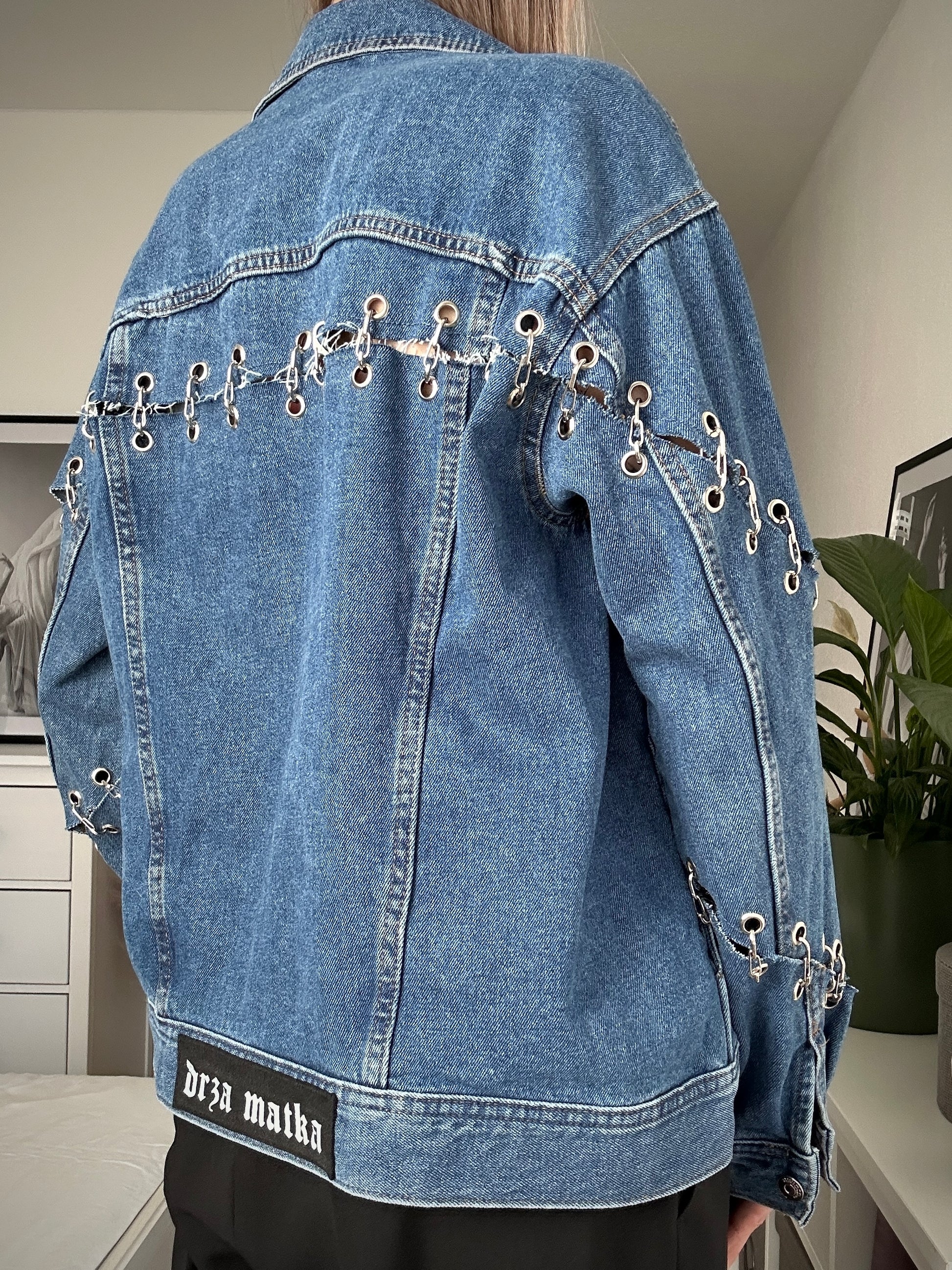Džínsová redizajnovaná bunda s ručne nabitými kovovými priechodkami a karabínami v modrom denime.