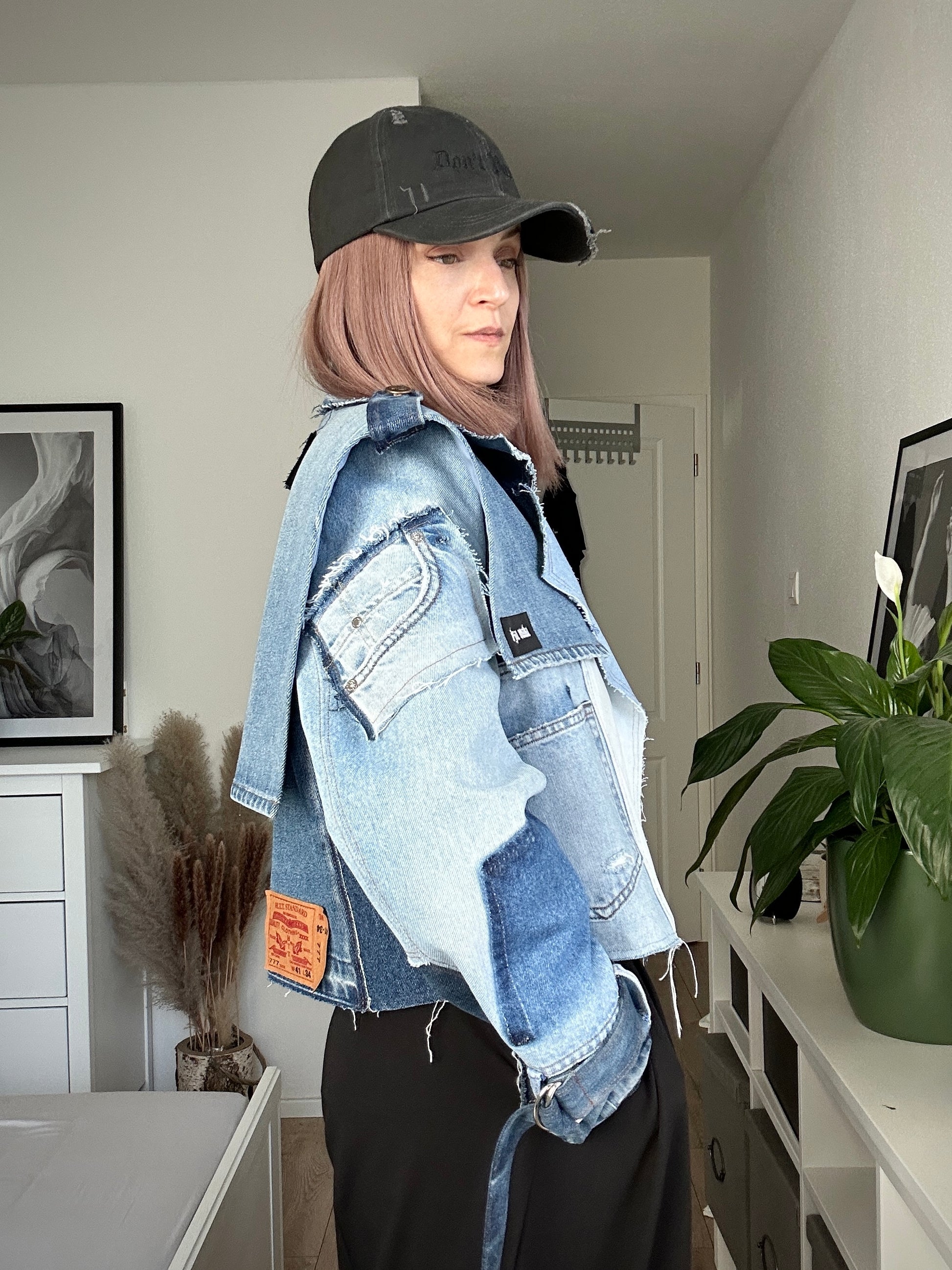 Denimový upcyklovaný trenčkot v cropp dĺžke voľného rovného strihu. Kabát má výrazné odopínateľné sedlo, vďaka čomu je možné trenčkot nosiť aj v jednoduchšej verzii bez neho.
